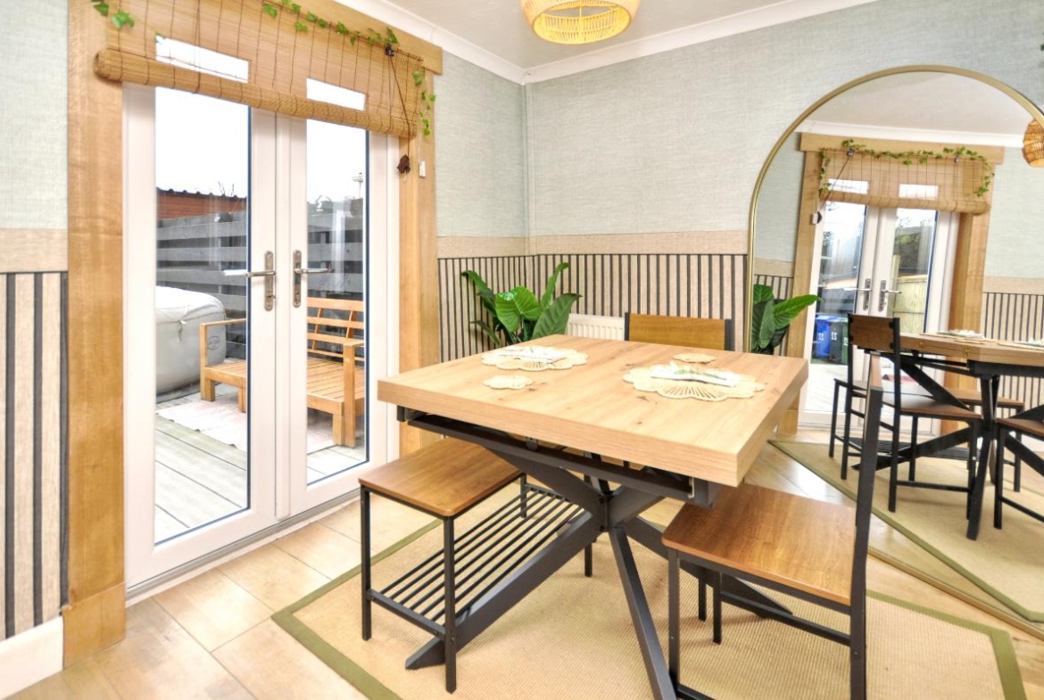 The dining room features French doors opening directly onto the decking