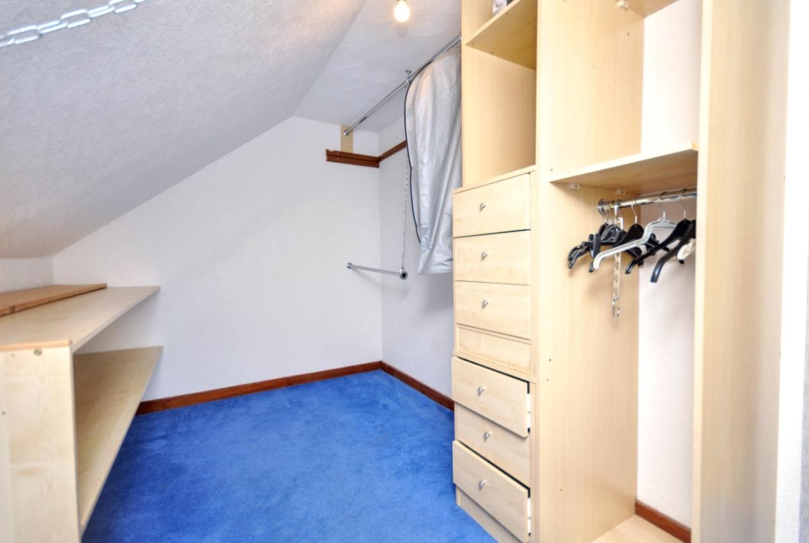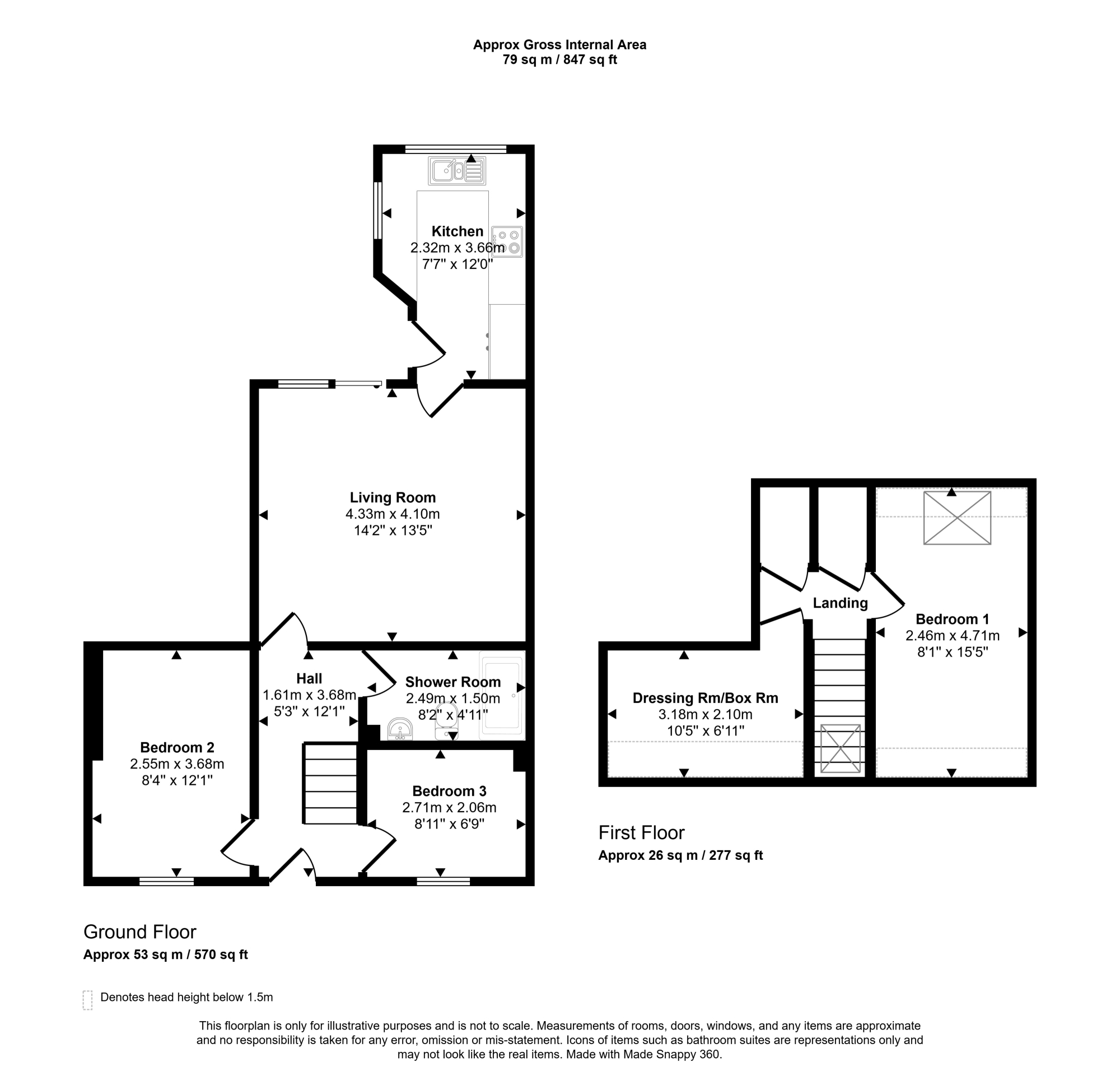 The accommodation is formed over two levels and offers excellent flexibility. On the ground floor there is an entrance hallway, a generously proportioned living room with patio doors opening to the rear garden, a fitted kitchen, two bedrooms and a shower room. Upstairs, there is a further double bedroom together with a useful dressing room/box room.